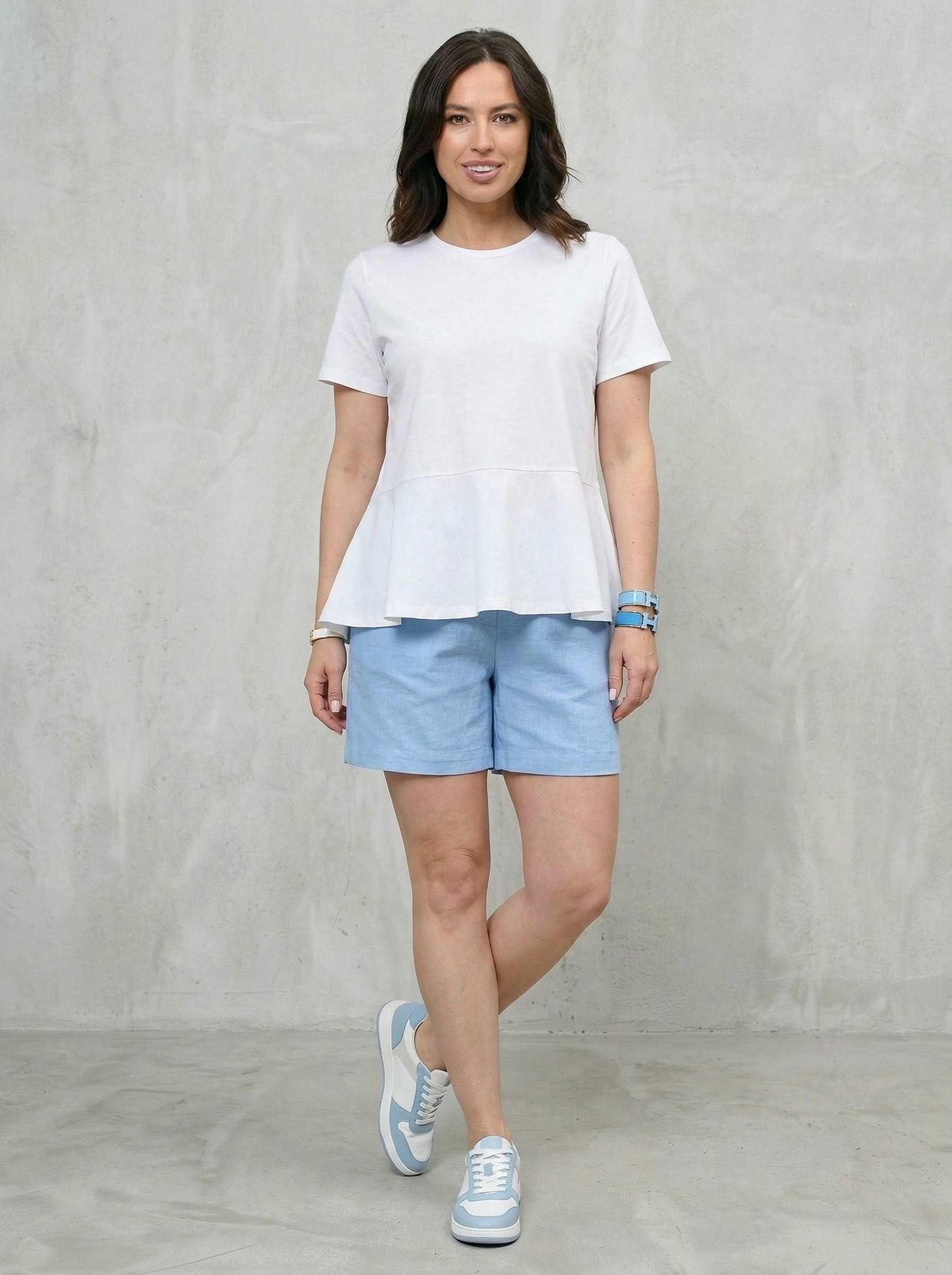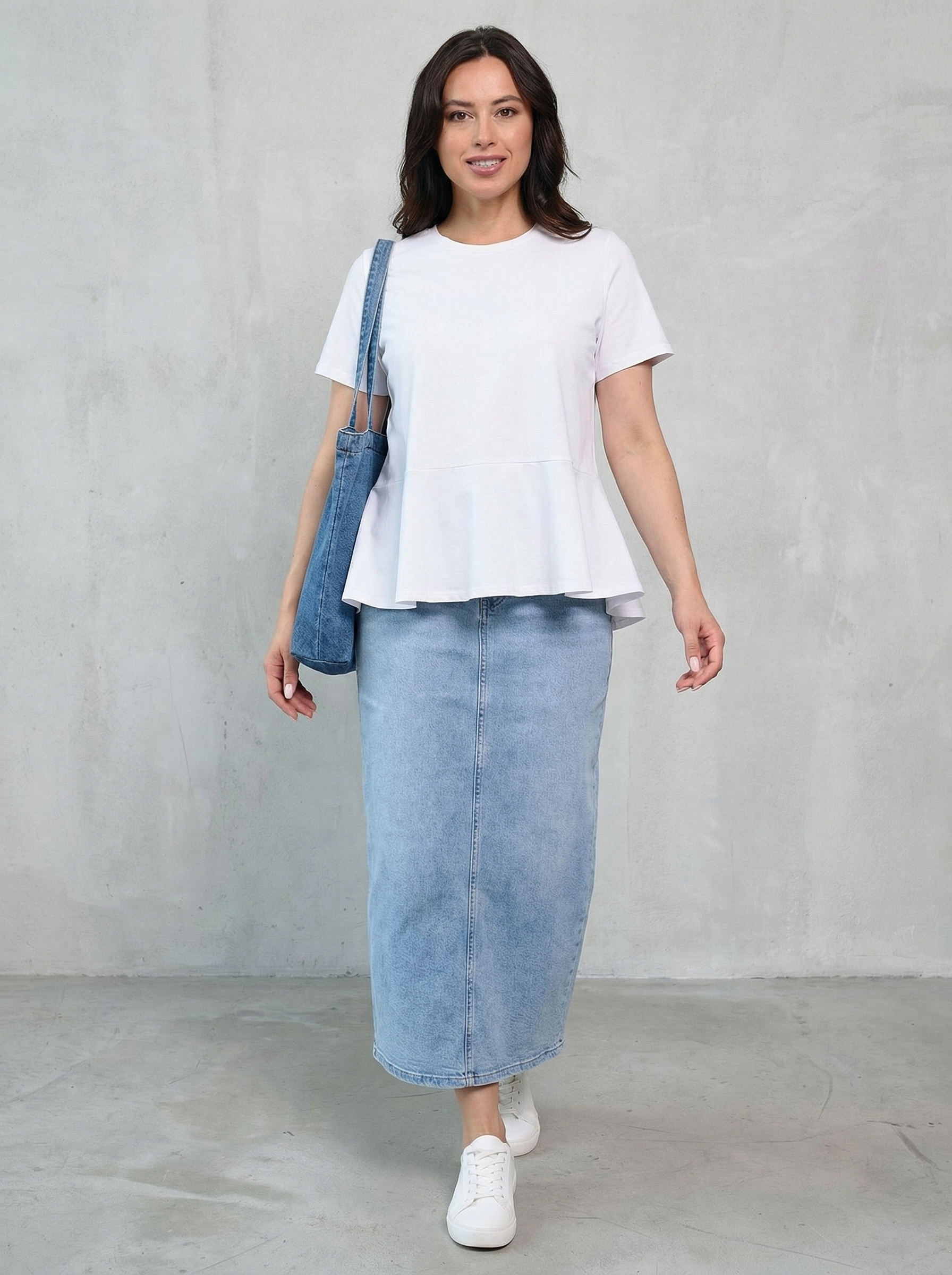Футболка женская больших размеров с баской. Отрезная баска по линии талии формирует силуэт фигуры песочные часы и создает образ более женственным и легким! Нами выбран качественный трикотаж, на 92% состоящий из хлопка. Хлопок превосходно отводит влагу и позволяет телу дышать. Эластан не дает материалу мяться, вытягиваться и терять свой внешний вид даже после многократных стирок. Однотонная футболка - это универсальный предмет гардероба. При создании одежды команда бренда всегда принимает во внимание девушек и женщин размера plus size. Мы знаем конструкторские особенности моделей больших размеров и учитываем это при пошиве. В нашей одежде вам будет удобно, в то же время вы будете яркой и молодой! Добавляйте магазин в избранное, чтобы не пропустить новинки!