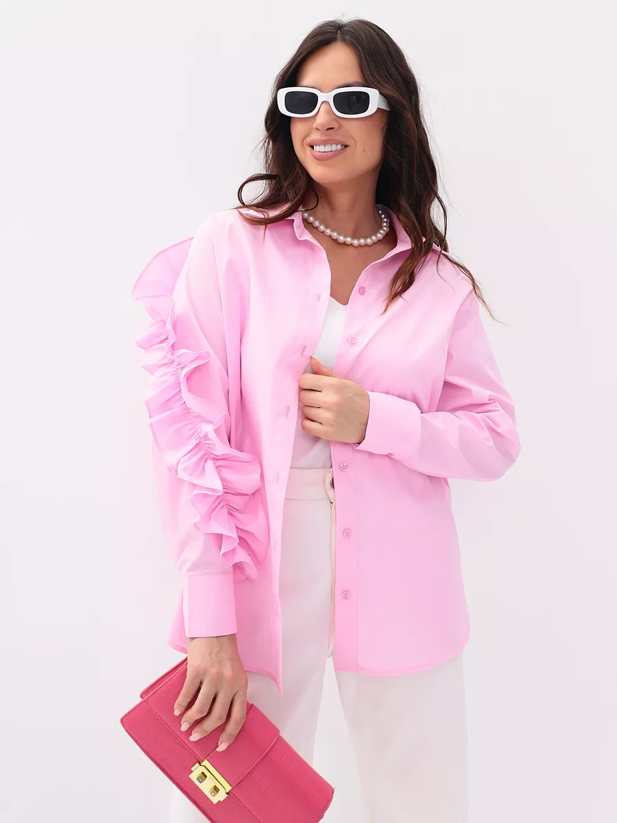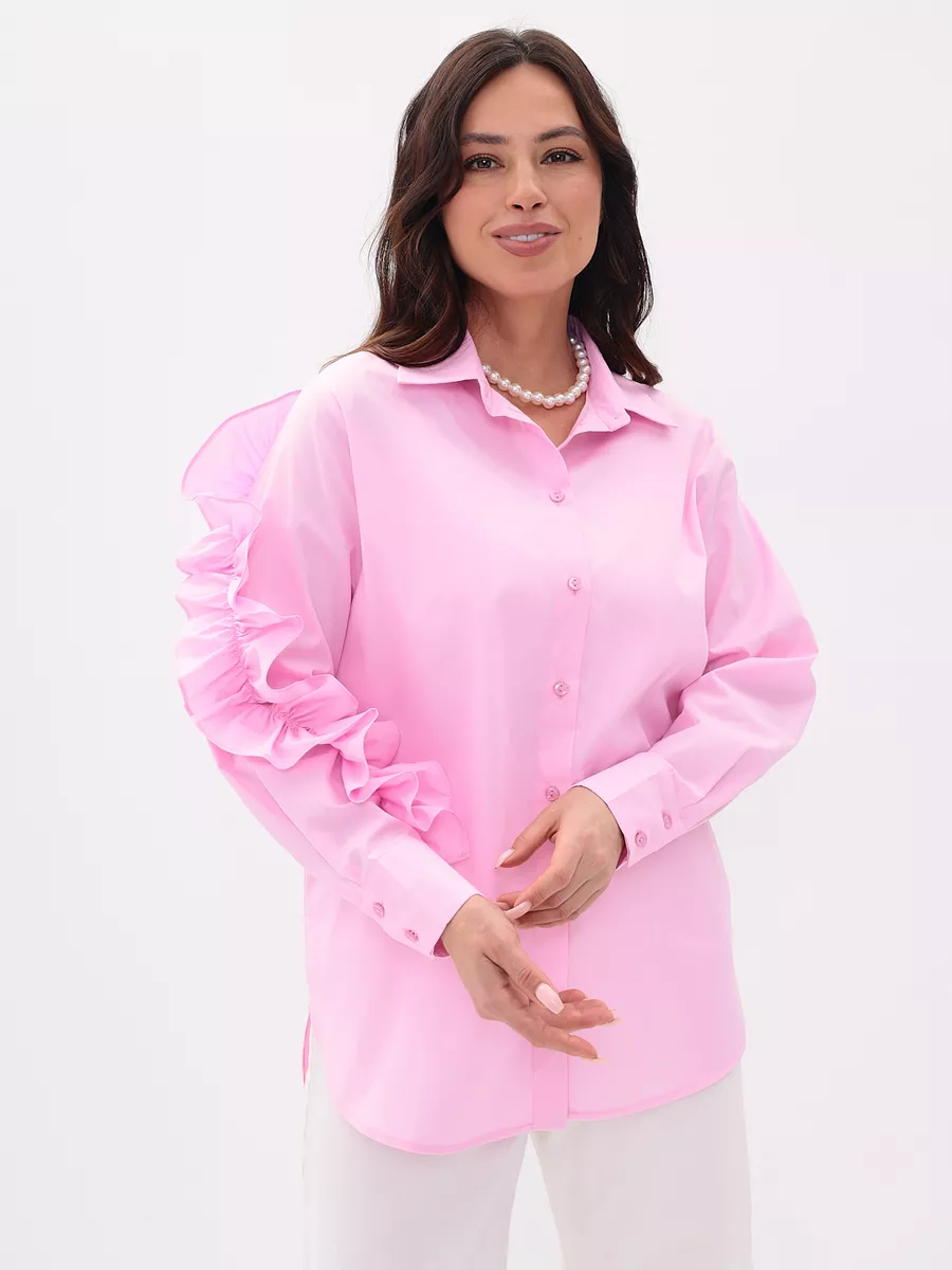 Женская рубашка больших размеров с воланами и рюшами — отличное решение для стильного и комфортного образа. Эта рубашка с акцентным декором на рукаве выполнена в свободном оверсайз крое, что делает её идеальной для женщин, ценящих удобство и свободу движений. Благодаря удлинённому фасону чуть ниже линии бёдер, её можно носить как заправленной в брюки или юбку (визуально удлиняя ноги), так и свободно на выпуск — это особенно актуально для тех, кто предпочитает стильную одежду для полных женщин, скрывающую нежелательные зоны.
