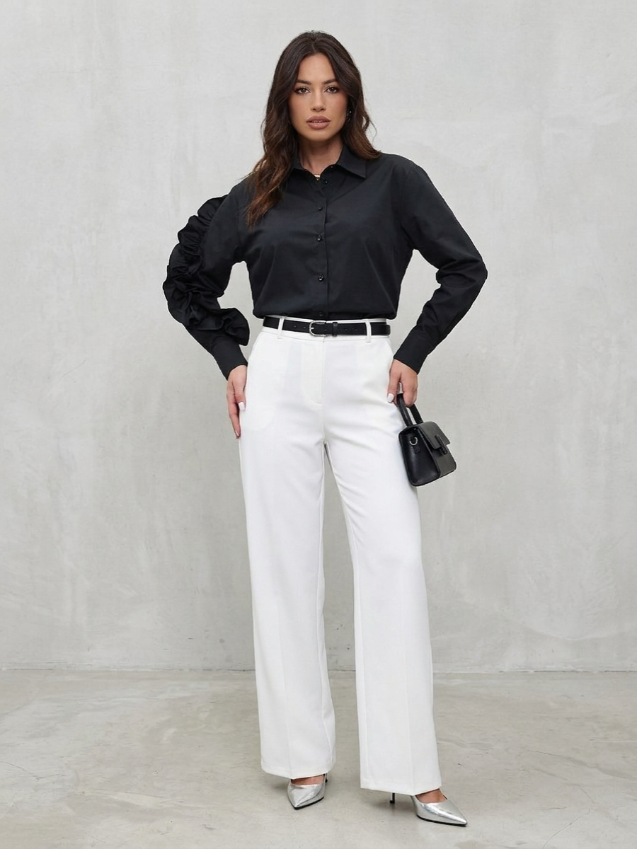 Блузка с рюшами и воланами представлена в нескольких актуальных оттенках: классическая белая, черная, нежно розовая и голубая. Объёмный декор на рукавах и выразительный силуэт делают модель особенно выразительной для женщин с пышными формами.
